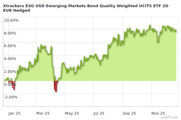 In diesem Abschnitt erhältst du Informationen über andere ETFs mit einem ähnlichen Anlageschwerpunkt wie der Xtrackers ESG USD Emerging Markets Bond Quality Weighted UCITS ETF 2D EUR Hedged.