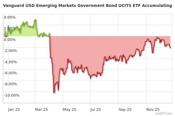 | Vanguard USD Emerging Markets Government Bond UCITS ETF Distributing | 601 | 0,23% p.a. | Ausschüttend | Sampling |