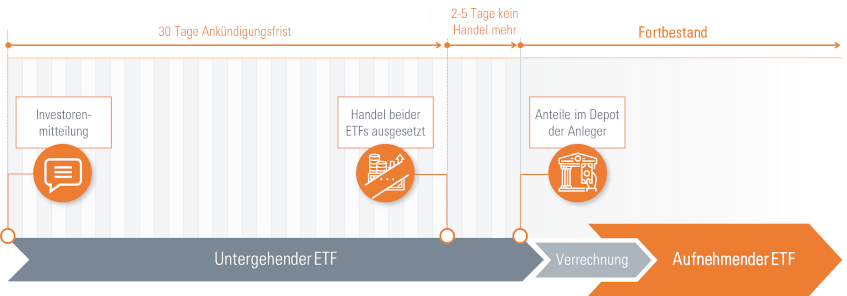 Im Zuge der Fusion erhalten Anleger Anteile am aufnehmenden ETF. Der untergehende ETF wird wenige Tage vor dem Fusionsdatum von der Börse genommen und ist nicht mehr handelbar. Während des Vorgangs ist wegen der erforderlichen Bestandsverrechnungen und -bewertungen in beiden ETFs für einige Tage kein Handel (weder Kauf noch Verkauf) von Anteilen möglich.