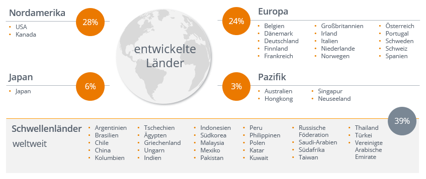 Märkte lassen sich in Industrieländer, sogenannte „Developed Markets”, und Schwellenländer, die „Emerging Markets” unterteilen. Zu den Industrieländern zählen die vier Regionen Nordamerika, Europa, Japan und Asien-Pazifik. Schwellenländer werden im Weltportfolio wie eine einzelne Region behandelt. Bei der Unterscheidung zwischen Industrieländern und Schwellenländern orientieren wir uns an der Länderklassifizierung des Indexanbieters MSCI.