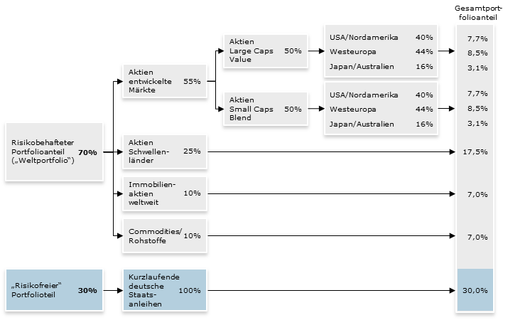 persönlicher Risikotoleranz in einen risikobehafteten Teil (Aktien, Rohstoffe, Immobilien, Gold) und einen risikoarmen Teil (Anleihen, Festgeld) auf. Während der risikobehaftete Teil vor allem zur Erwirtschaftung der Rendite ins Portfolio aufgenommen wird, dient der risikoarme Teil zur Anpassung des Risikos für das gesamte Weltportfolio. Die Beimischung von