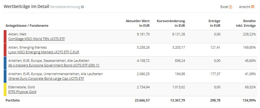 Du hast auch die Möglichkeit eines Excel-Exports. Klicke auf „Tägl. Portfoliowerte als Excel”, um den Performance-Chart als Datenreihe in Excel herunterzuladen. Klicke bei der Detailansicht der Wertbeiträge auf „Excel”, um die Tabelle im Excel-Format herunterzuladen.