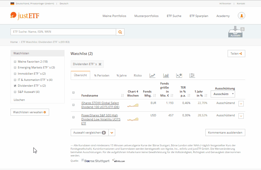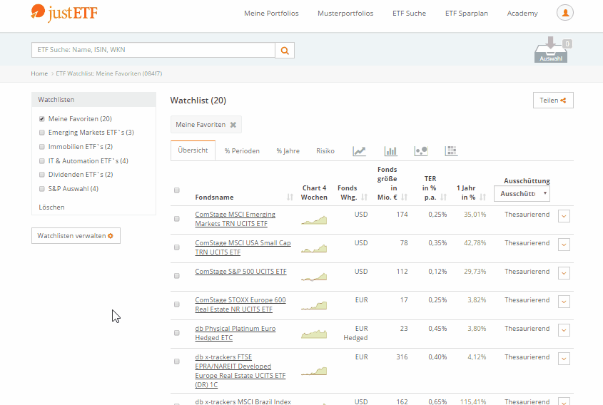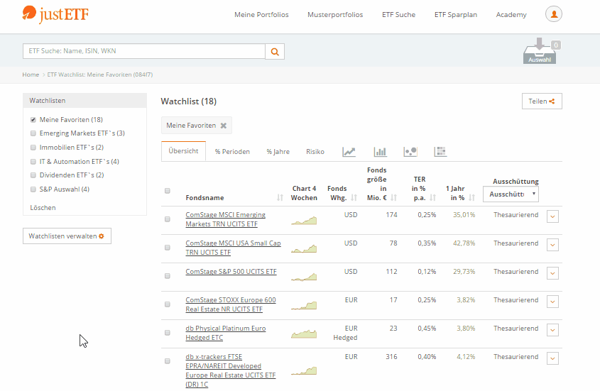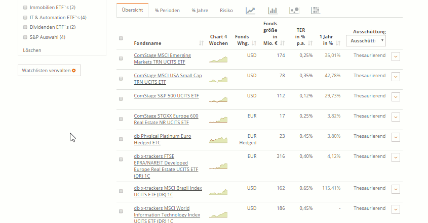 Einen oder mehrere ETFs in einer Watchlist speichern