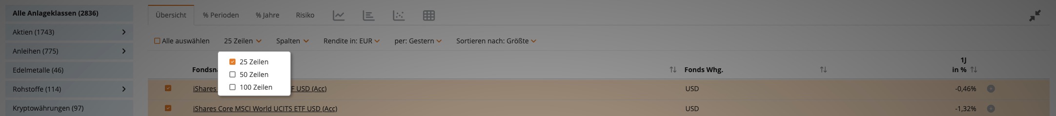 Wenn du mehr ETFs auf einen Blick vergleichen willst, kannst du dir über die Option „Zeilen” bis zu 100 Suchergebnisse pro Seite anzeigen lassen.