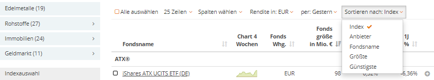 Du kannst die Suchergebnisse aber auch nach anderen Kriterien wie „Index”, „Anbieter” und „Fondsname” oder nach den größten („nach Fondsvolumen”) und günstigsten ETFs („nach Kostenquote TER”) sortieren.