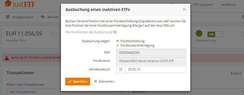 Sollte sich ein inaktiver ETF in deinem Portfolio befinden, wirst du mit der Warnmeldung „Inaktiver ETF im Portfolio” darauf hingewiesen.