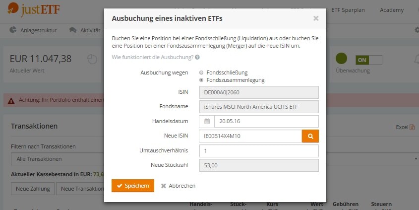 Hier sind bereits der neue Fonds, Umbuchungsdatum und Umrechnungskurs für die aktuellen Fondszusammenschlüsse hinterlegt. Sollten keine Daten hinterlegt sein, erfährst du diese von deiner Bank oder dem ETF-Anbieter direkt.