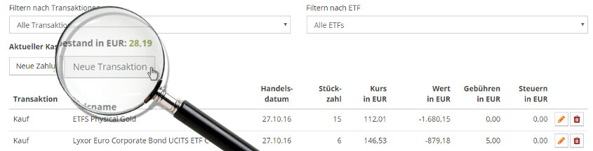 Klicke auf den Button „Neue Transaktion“, um manuell eine Einlieferung oder Auslieferung zu deinem Portfolio hinzuzufügen. Diese beiden Transaktionsarten haben keinen Einfluss auf den virtuellen Kassebestand deines Portfolios.