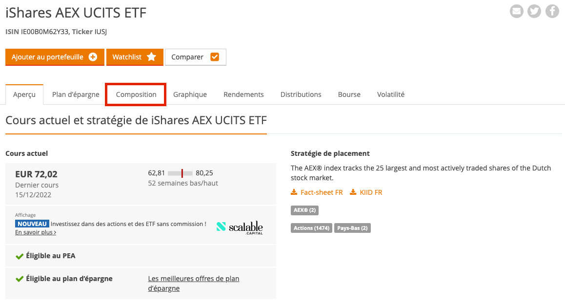 L'onglet « Composition » du profil ETF vous permet d'obtenir des informations sur les titres dans lesquels l'ETF considéré investit. Cliquez simplement sur l'onglet "Composition" du profil ETF pour accéder à l'endroit correspondant dans le profil ETF.