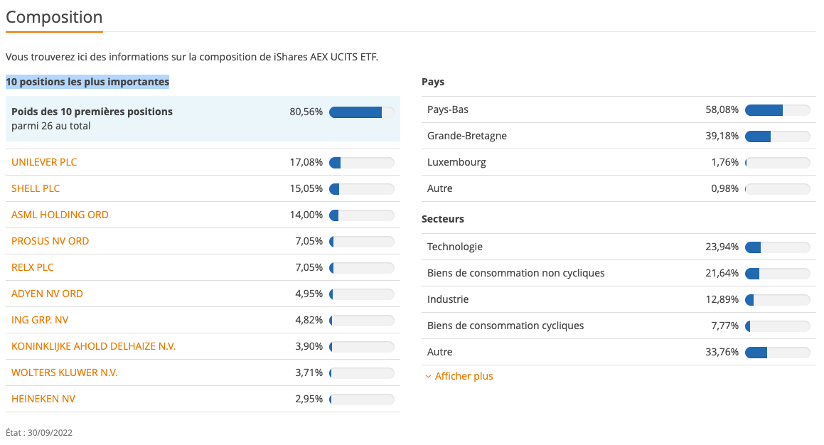 Par défaut, jusqu'à cinq secteurs sont affichés. Si un ETF investit dans plus de cinq secteurs, vous pouvez développer le tableau à l'aide du bouton "Afficher plus" et afficher tous les secteurs supplémentaires.
