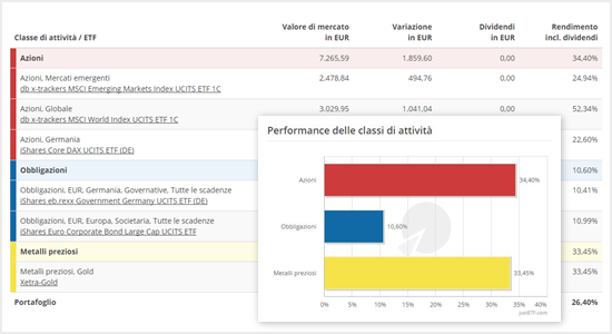 Analizzate come un professionista la tua performance a livello di portafoglio, di strumento finanziario e di ETF nei periodi da voi liberamente selezionati. L'analisi sarà rappresentata con eloquenti grafici a linee ed a barre.