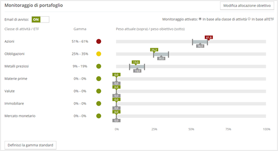 Il nostro software monitora quotidianamente il tuo portafoglio e vi tiene informati sulle variazioni indesiderate. Ciò è possibile grazie alla personale definizione dei limiti e delle soglie di variazione a livello di strumento finanziario e di singolo ETF.