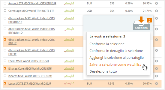 Le watchlist sono disponibili nella ricerca degli ETF e vi permetteranno di fare comparazioni di listino e grafiche con un solo clic.