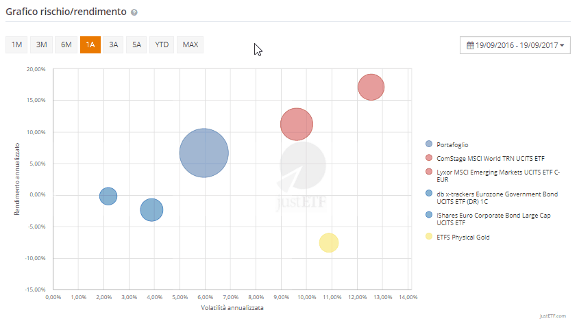 La bolla mostra il rendimento (sull’asse verticale) e la volatilità (sull’asse orizzontale) annualizzata di un ETF.