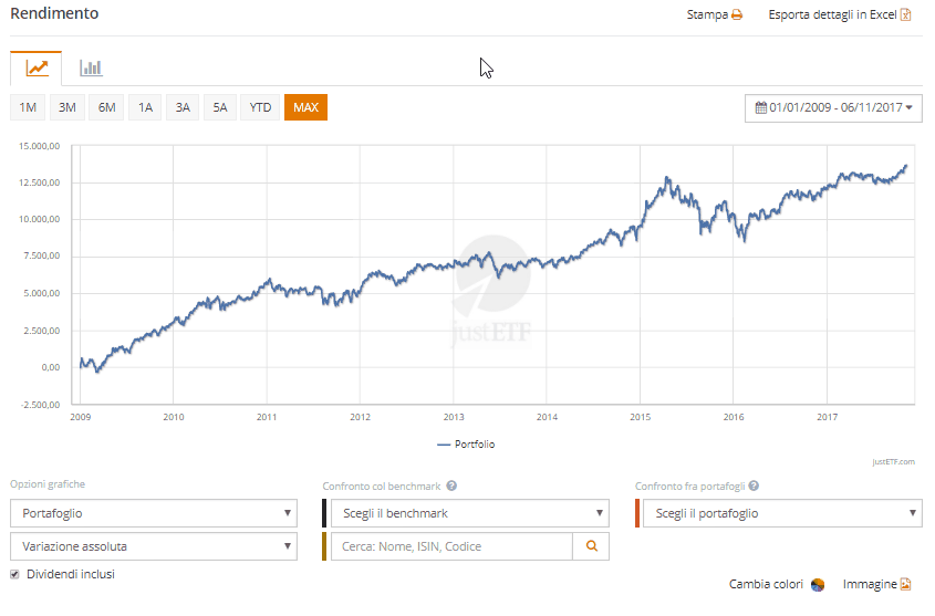 Seguite lo sviluppo del vostro portafoglio, classi di attività ed ETF. Potete modificare il grafico in base alle vostre esigenze e potete aggiungere benchmark o portafoglio per fare confronti.