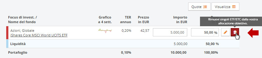 Cliccando sull’icona del cestino presente nell’ultima colonna della tabella, potete eliminare un ETF dal vostro portafoglio.