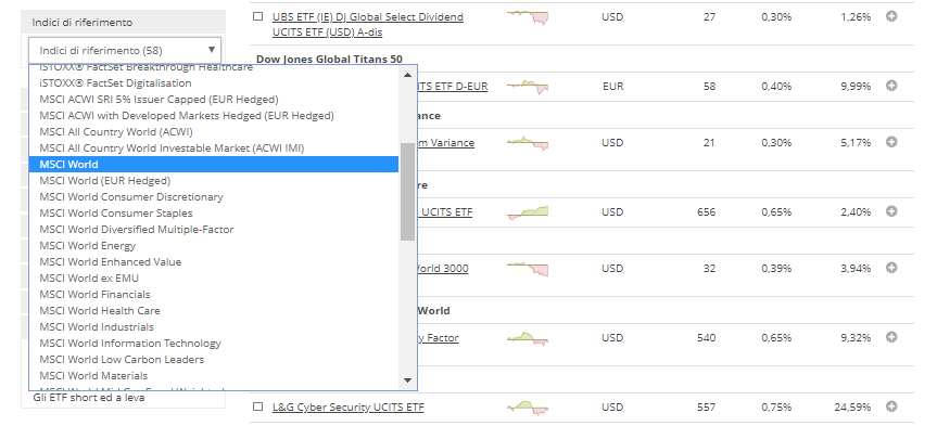 Grazie al filtro "famiglia di indici" potete restringere la selezione dei vostri ETF ad uno o più fornitori di indici, come FTSE o MSCI.