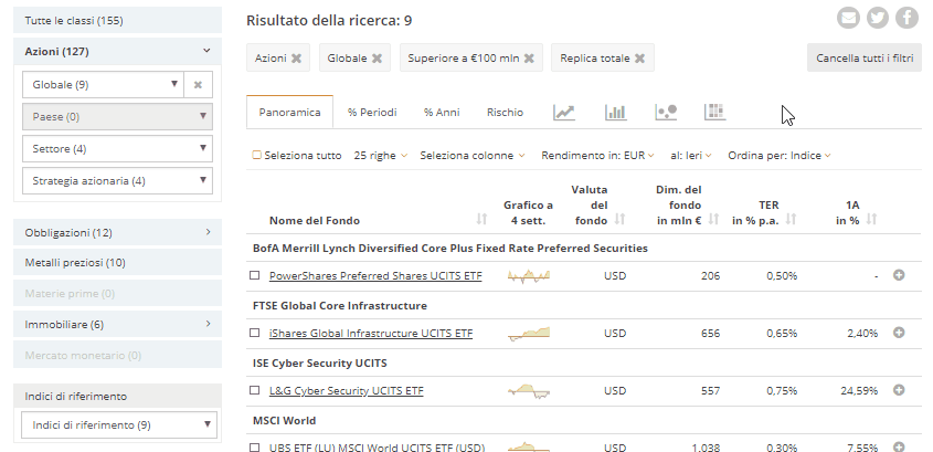 selezione degli ETF utilizzando ulteriori filtri.