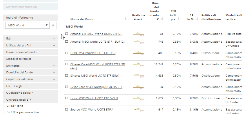 strategia di investimento. Per restringere gradualmente gli ETF idonei passo dopo passo, potete utilizzare le nostre conveniente funzioni di filtro. Se nessun filtro è stato selezionato, tutti gli ETF negoziati sul mercato borsistico locale, come ad esempio Borsa Italiana, saranno visualizzati. Selezionando un filtro, potete restringere la selezione con accuratezza.
