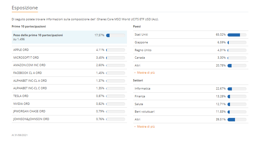 By default, up to five sectors are displayed. If an ETF invests in more than five sectors, you can expand the table using the "Show more" button and view all additional sectors.