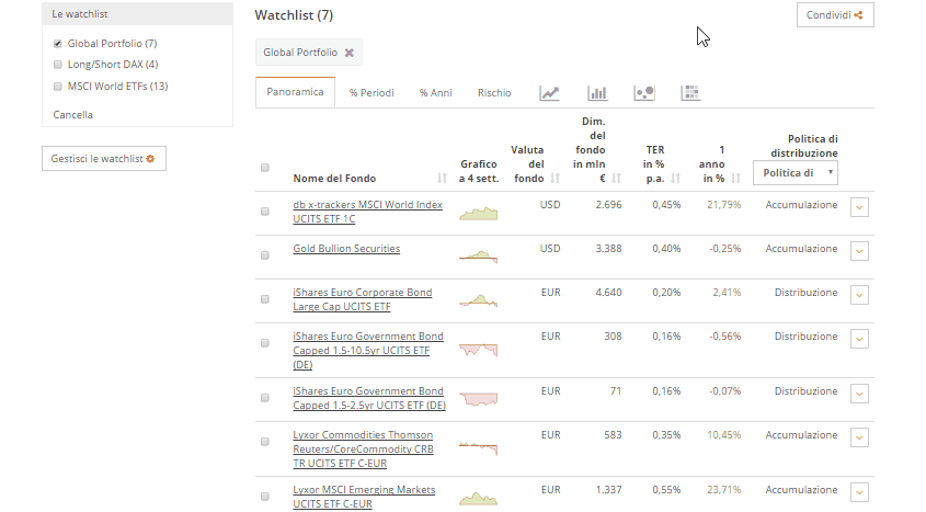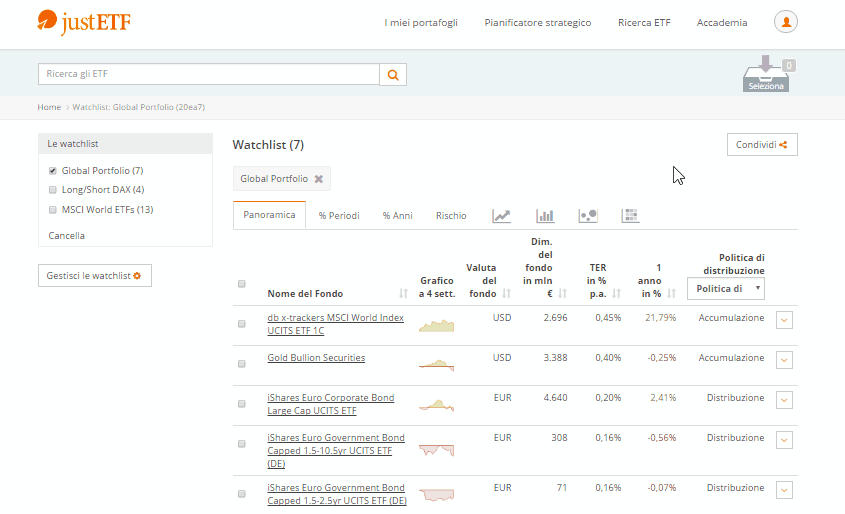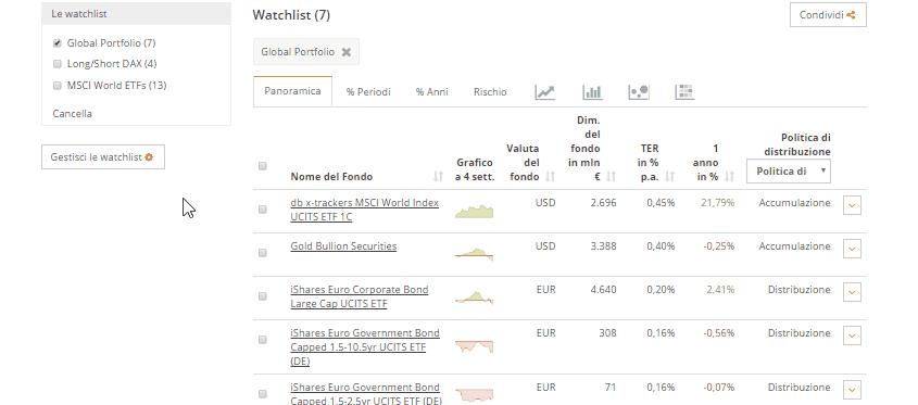 Le watchlist di justETF forniscono un facile accesso ai vostri ETF preferiti, vi consentono di prendere nota e fare commenti personali o di condividere la vostra lista con gli amici.
