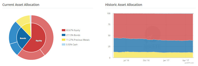 The pie chart on the left shows, at a glance, in which asset classes you are invested and what share they make up in your portfolio. Move the mouse over the outer edge of the pie chart to display the corresponding ETFs.